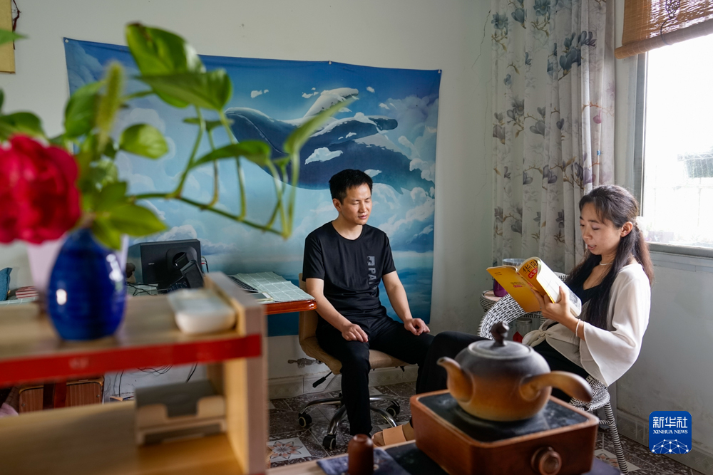 在四川省什邡市馬井鎮同心村,宇曉為王忠禮讀書(shū)(8月2日攝)。