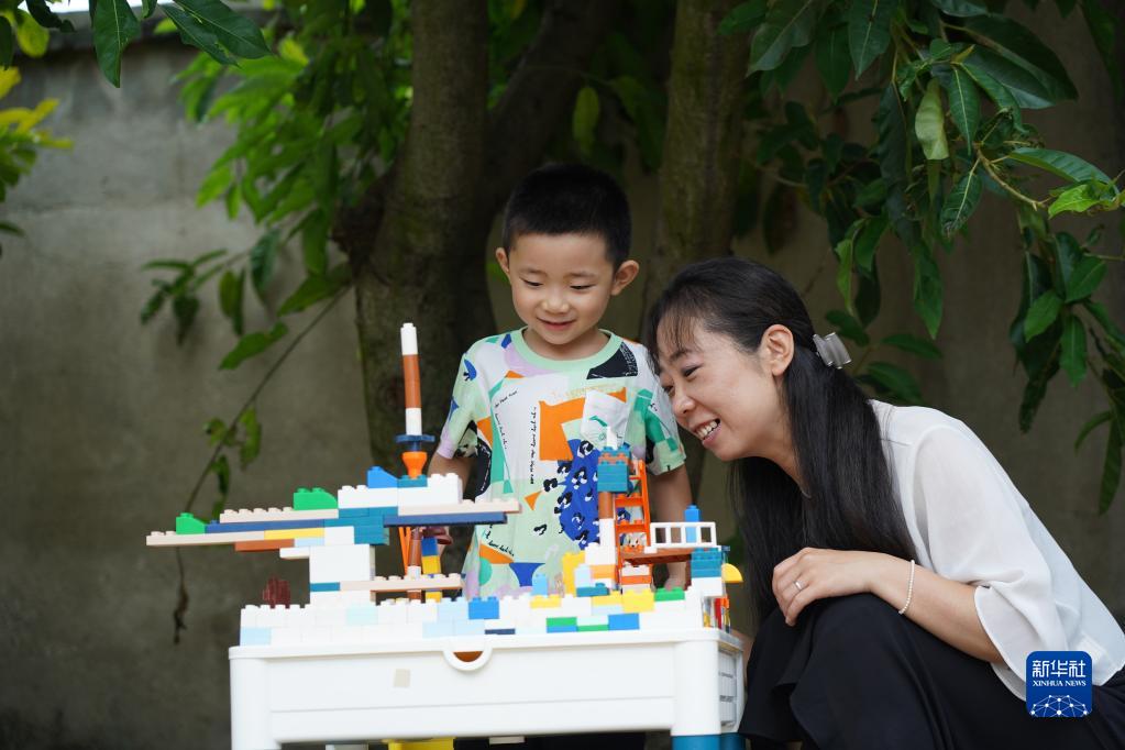 在四川省什邡市馬井鎮同心村,宇曉和兒子在院中玩耍(8月2日攝)。