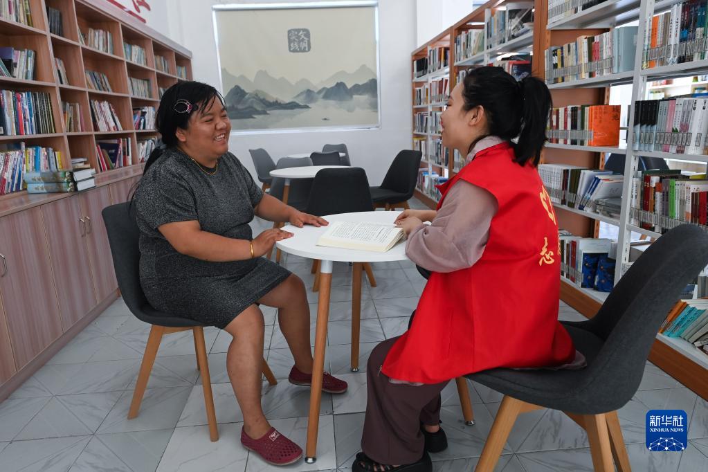 8月4日,在東林鎮新時(shí)代文明實(shí)踐所內,志愿者(右)給殘疾人進(jìn)行日常心理輔導。