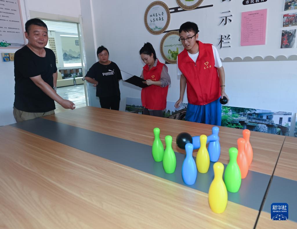 8月4日,在東林鎮新時(shí)代文明實(shí)踐所內,殘疾人在參加特色文體活動(dòng)項目“桌上保齡球”。