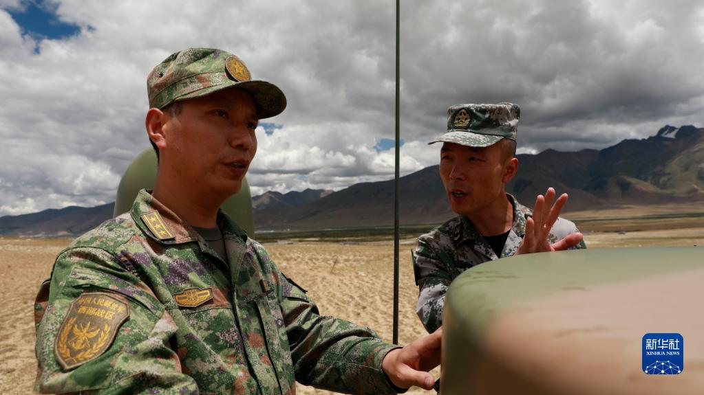西部戰區聯(lián)合參謀部某局處長(cháng)王道彬(左)組織車(chē)載監測設備訓練(2022年7月14日攝)。