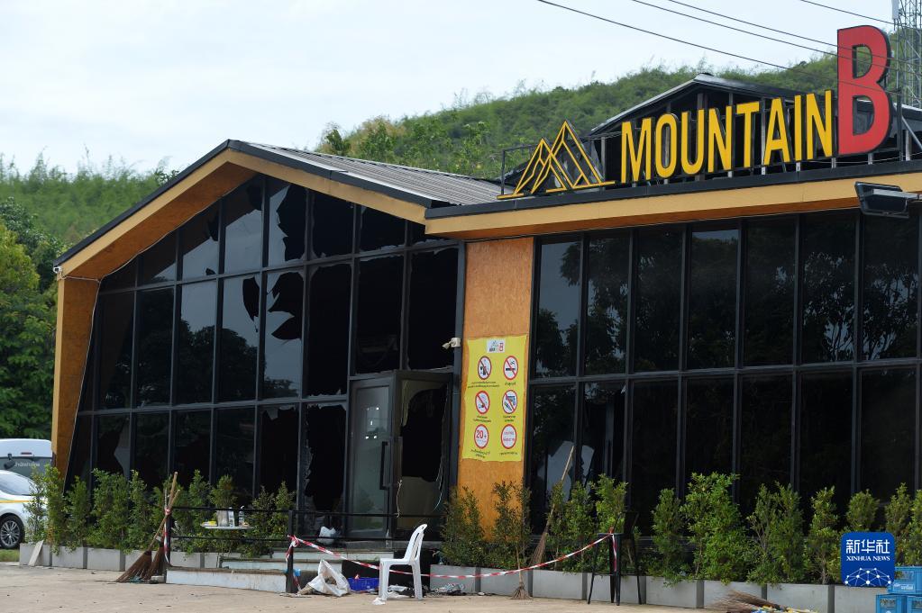這是8月5日在泰國春武里府梭挑邑地區拍攝的發(fā)生火災后的夜總會(huì )外景。