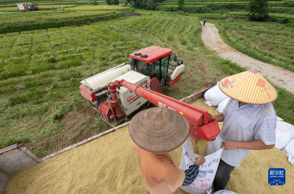 8月5日,農民在貴州省銅仁市萬(wàn)山區魚(yú)塘鄉江屯村的田間收獲早稻。