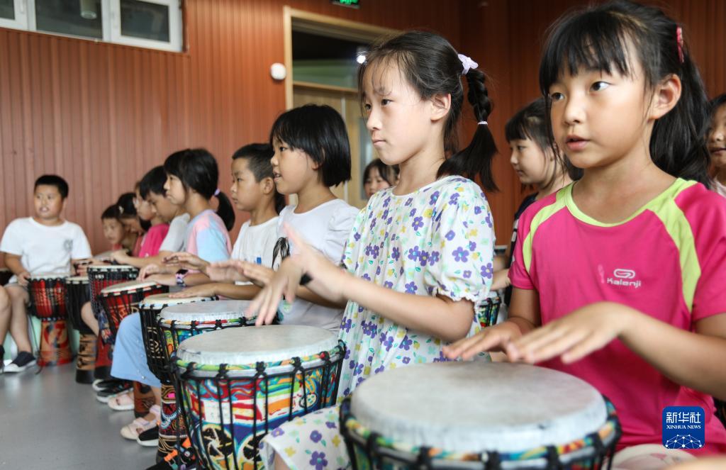 8月4日,在遼寧省沈陽(yáng)市渾南區第九小學(xué),參加暑期托管班的學(xué)生學(xué)習非洲鼓。