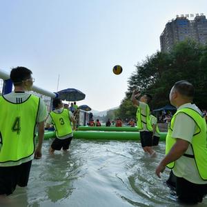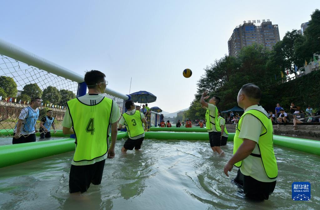近日,湖北省宣恩縣在當地仙山貢水旅游區的貢水河上舉行水上運動(dòng)會(huì )。別具一格的“水上排球”項目吸引了眾多市民和游客參加比賽,享受水上趣味運動(dòng)帶來(lái)的歡樂(lè )。
