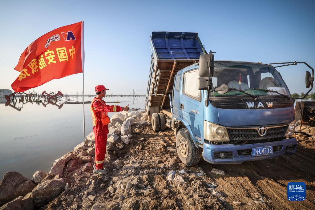 8月5日,中國安能集團搶險人員指揮運送搶險物料的車(chē)輛在潰口處進(jìn)行封堵作業(yè)。