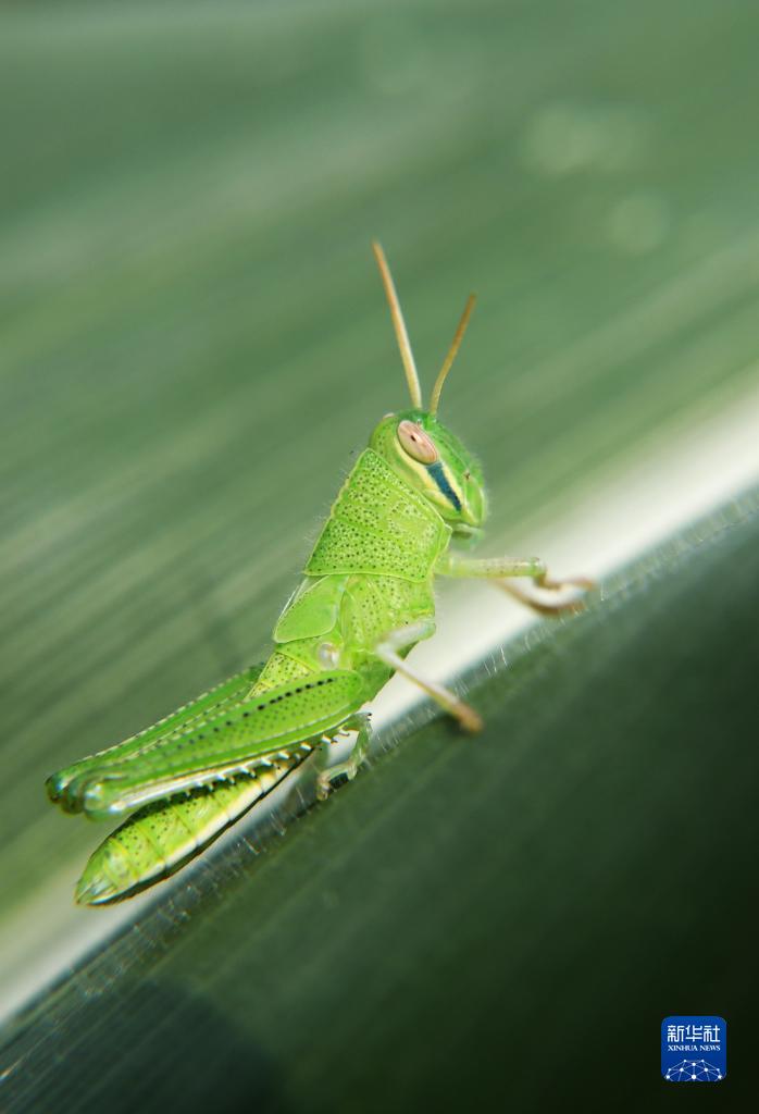 7月25日,在四川省達州市,蚱蜢停在玉米葉上。