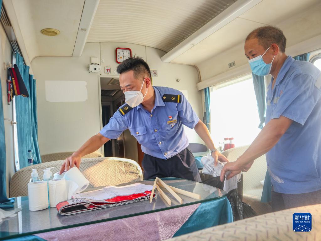 8月5日,在重慶西客車(chē)整備所,守車(chē)車(chē)長(cháng)丁璐(左)和庫內保潔員對次日列車(chē)低耗品進(jìn)行檢查確認。