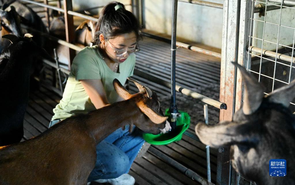 8月5日,汪淇在羊舍里給山羊喂水。