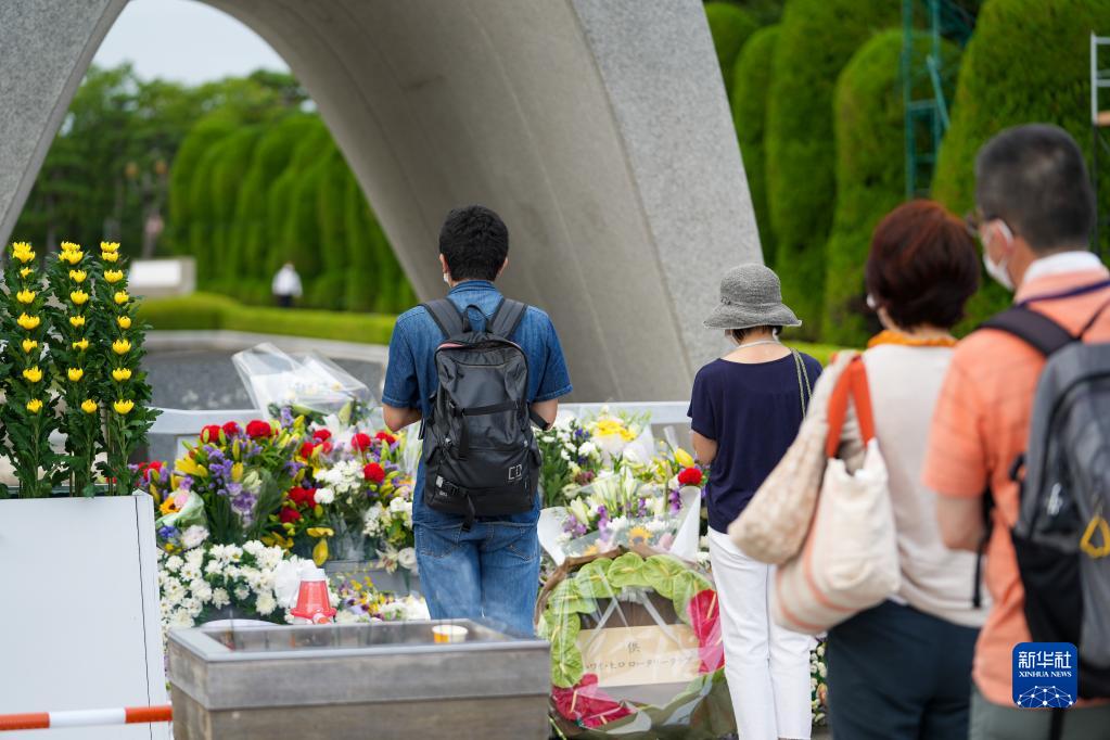 8月5日,人們在日本廣島和平紀念公園的和平都市紀念碑前獻花。