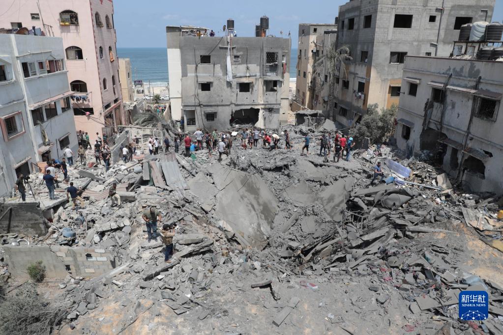 8月6日,人們在加沙城查看空襲后的廢墟。