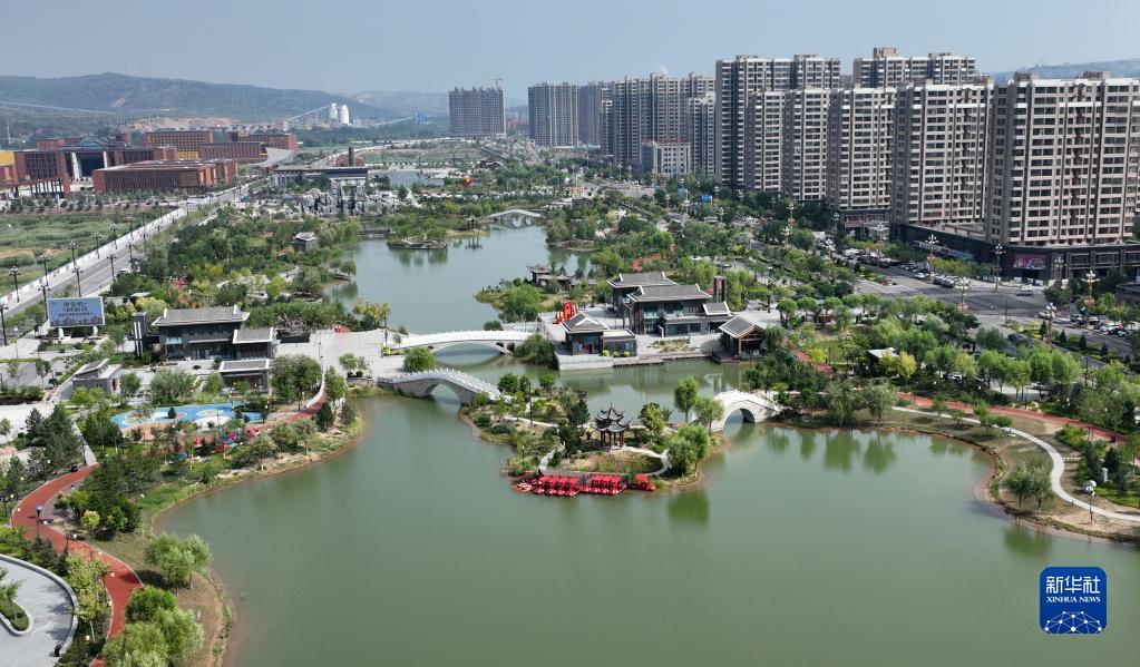神木市濱河新區楊業(yè)公園一景(8月3日攝,無(wú)人機照片)。神木市著(zhù)力開(kāi)展生態(tài)空間綠化美化,提供優(yōu)質(zhì)生態(tài)產(chǎn)品,逐步形成功能完備的林業(yè)資源空間布局。