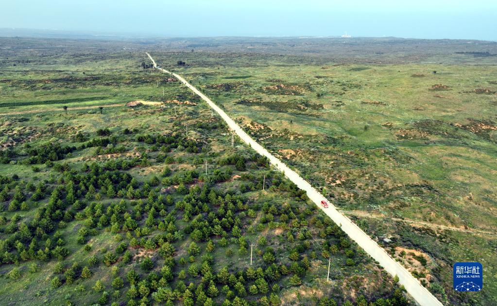 一輛汽車(chē)行駛在神木市西沙街道黃家廟村境內的毛烏素沙地道路上(8月2日攝,無(wú)人機照片)。神木市境內的沙地已被綠色覆蓋,隨處可見(jiàn)“綠肥黃瘦”景觀(guān)。