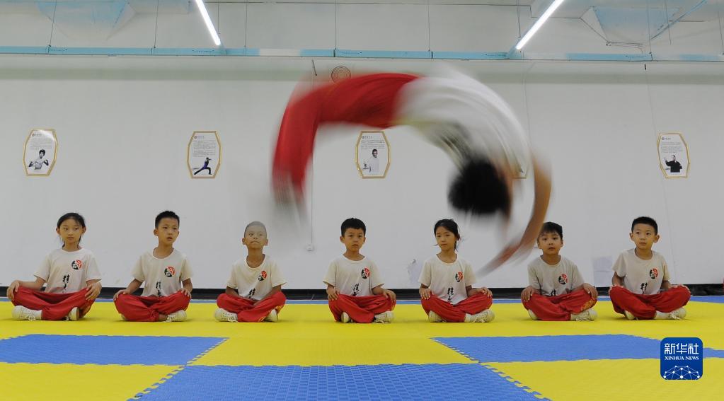 8月8日,小朋友在山東省滕州市一家武術(shù)培訓機構訓練。