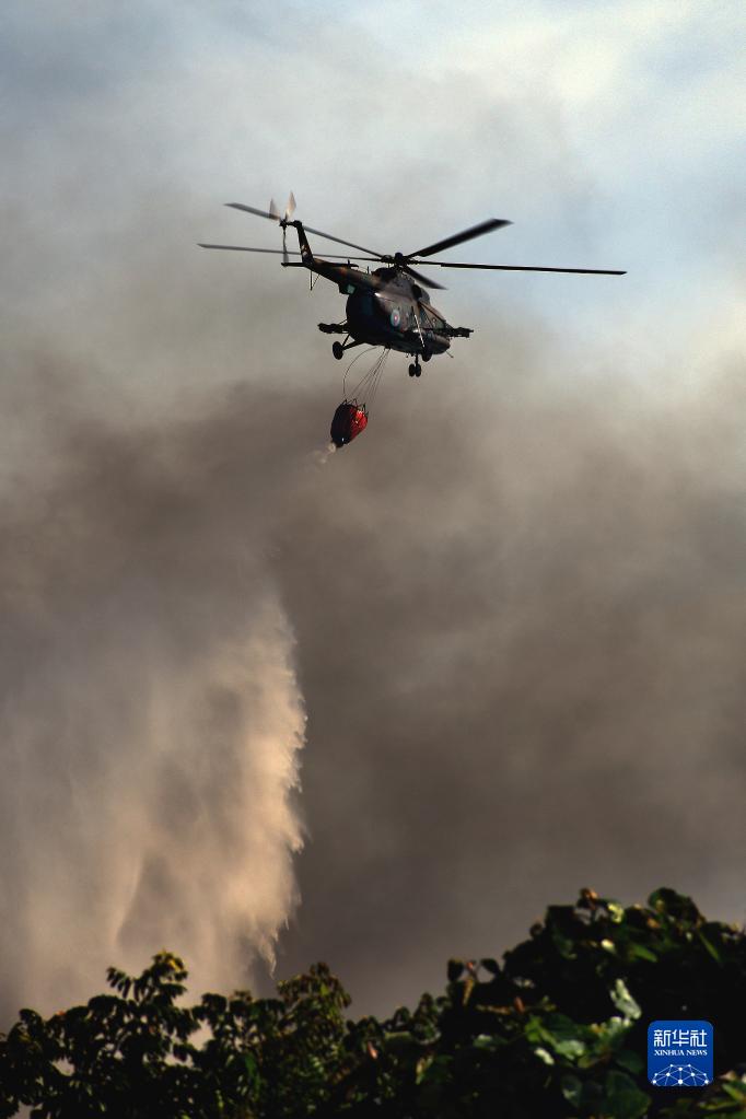 8月8日,在古巴馬坦薩斯省,消防直升機在火災現場(chǎng)作業(yè)。