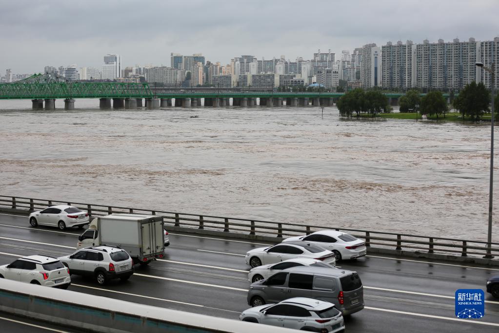 8月9日,車(chē)輛在韓國首爾的沿江公路上行駛,旁邊是受強降雨影響而水位上漲的漢江。