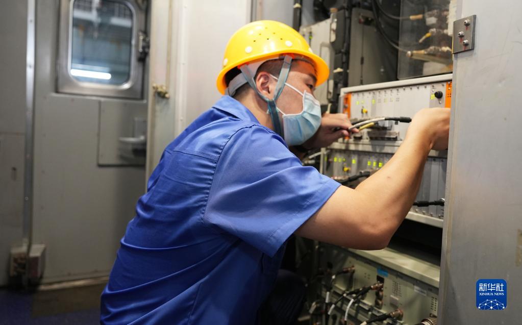 在中國鐵路上海局集團有限公司南京動(dòng)車(chē)所內,南京電務(wù)段動(dòng)車(chē)車(chē)載設備車(chē)間工作人員檢修動(dòng)車(chē)行車(chē)記錄設備(8月3日攝)。