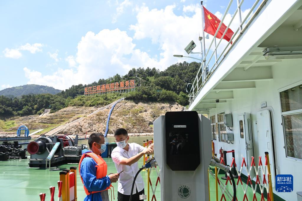 8月9日,長(cháng)江三峽通航管理局工作人員為船員講解岸電充電樁的使用方法。 新華社記者 蔡湘鑫 攝