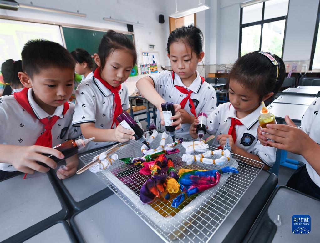 8月10日,湖州市吳興實(shí)驗小學(xué)的學(xué)生在“博學(xué)課堂”上學(xué)習傳統扎染。 新華社記者 徐昱 攝