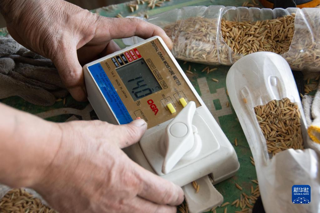 8月10日,在湖南省常德市漢壽縣毛家灘回族維吾爾族鄉牛路社區一糧食收購點(diǎn),工作人員測量稻谷含水量。 新華社記者 柳王敏 攝