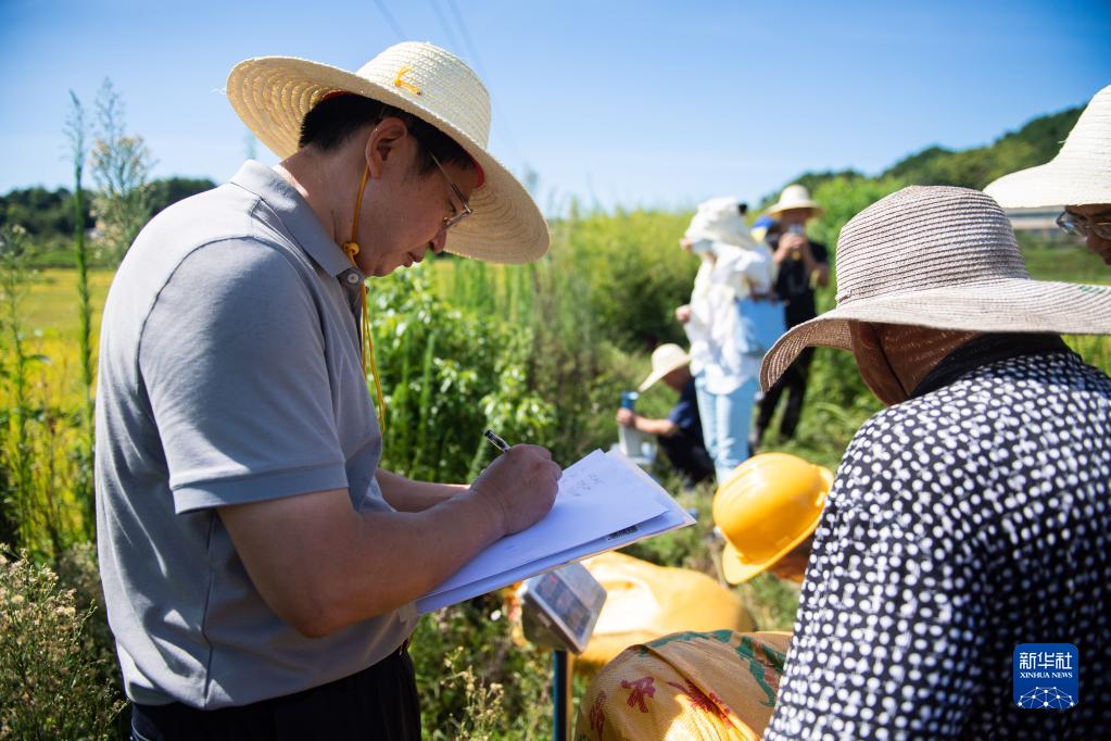 8月10日,在 “一季雜交稻+再生稻”生產(chǎn)模式寧鄉示范基地頭季稻測產(chǎn)驗收現場(chǎng),工作人員記錄稻谷重量。
