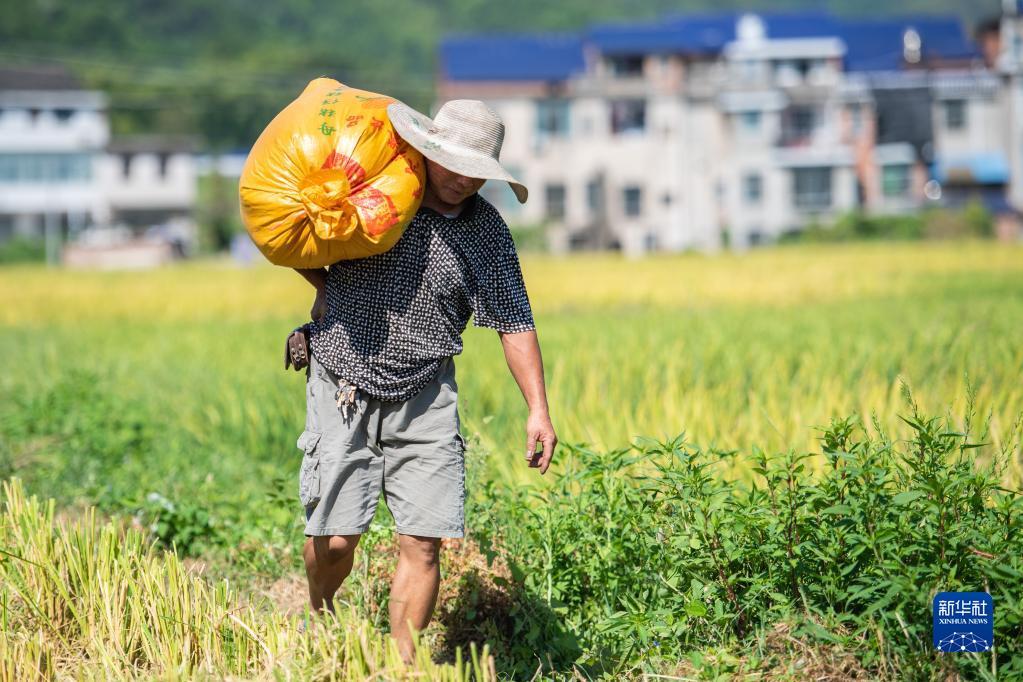8月10日,在 “一季雜交稻+再生稻”生產(chǎn)模式寧鄉示范基地頭季稻測產(chǎn)驗收現場(chǎng),工作人員搬運打包好的稻谷。