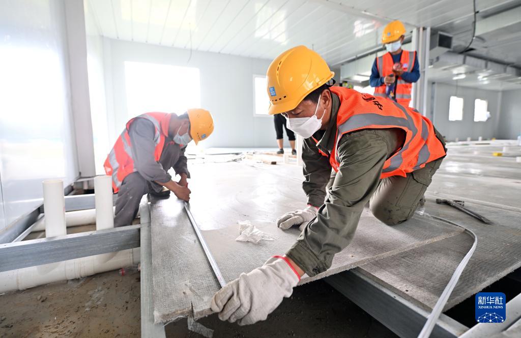 8月10日,工人在三亞第二方艙醫院作業(yè)。