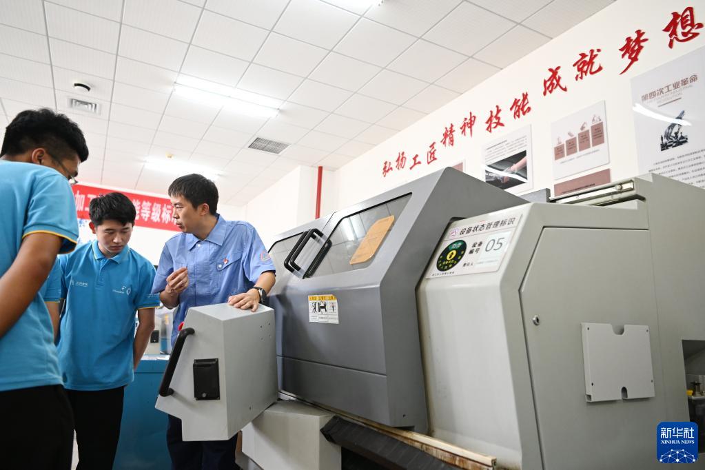 許超(右一)在天津機電職業(yè)技術(shù)學(xué)院的教室內給學(xué)生講解設備操作要領(lǐng)(8月8日攝)。新華社記者 李然 攝