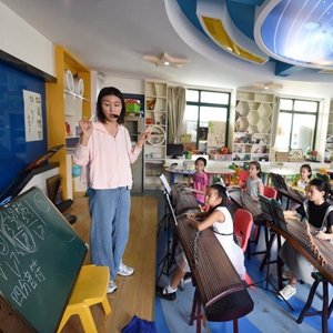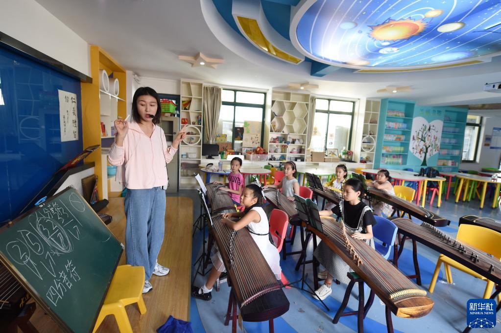 8月10日,在合肥市鳳凰城小學(xué)暑期托管班里,學(xué)生在老師指導下學(xué)習古箏。