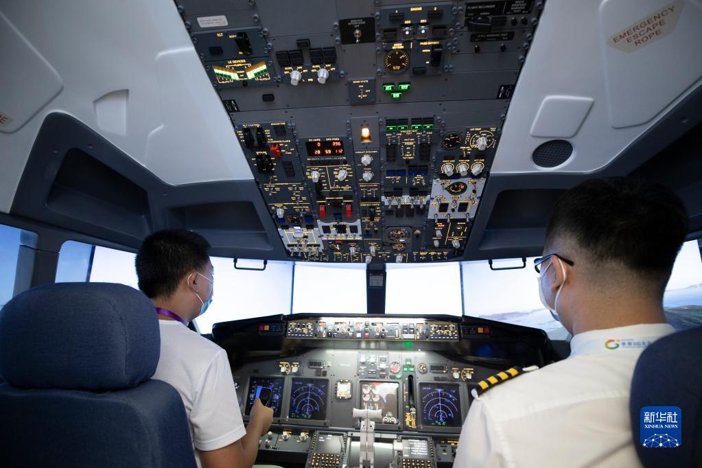 8月11日,在2022世界5G大會(huì )展廳里,參觀(guān)者體驗5G網(wǎng)絡(luò )支持下的模擬飛行艙。