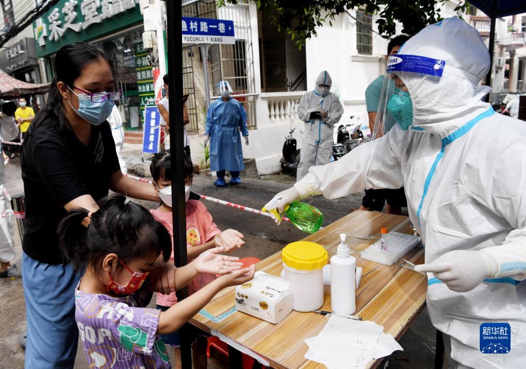 8月11日,在三亞市天涯區南邊海漁村,河南省援海南三亞醫療隊的醫護人員原清怡為群眾消毒。