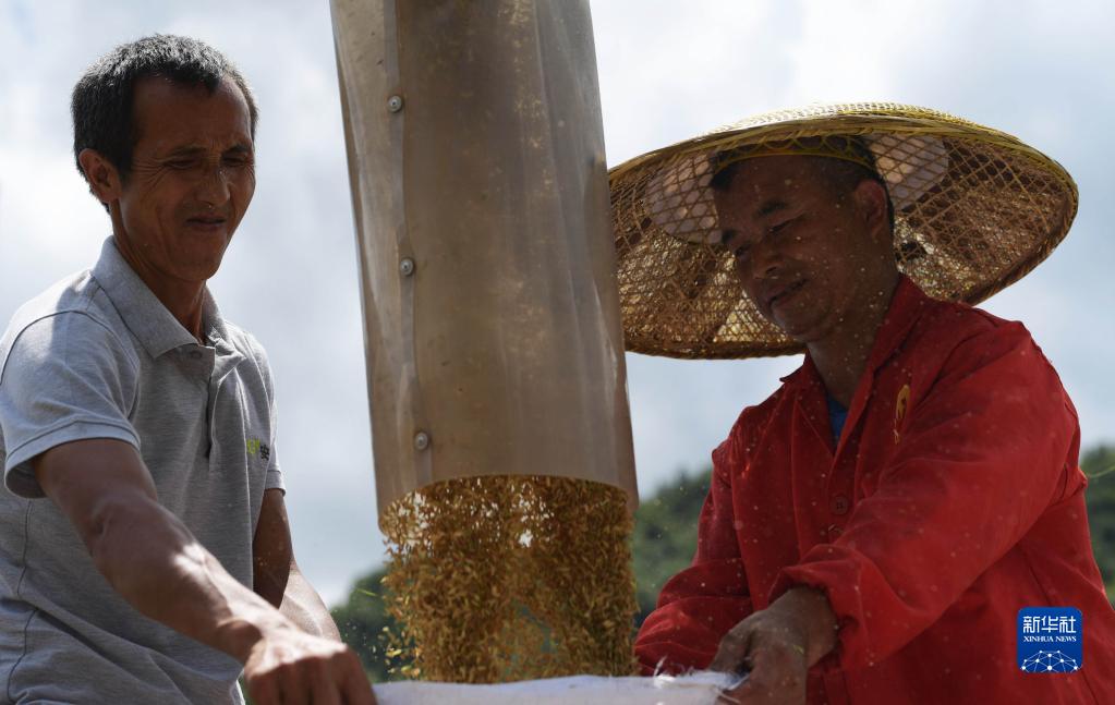 8月11日,村民在貴州省黔東南苗族侗族自治州岑鞏縣注溪鎮周坪村雜交水稻制種基地將采收的種稻裝袋。