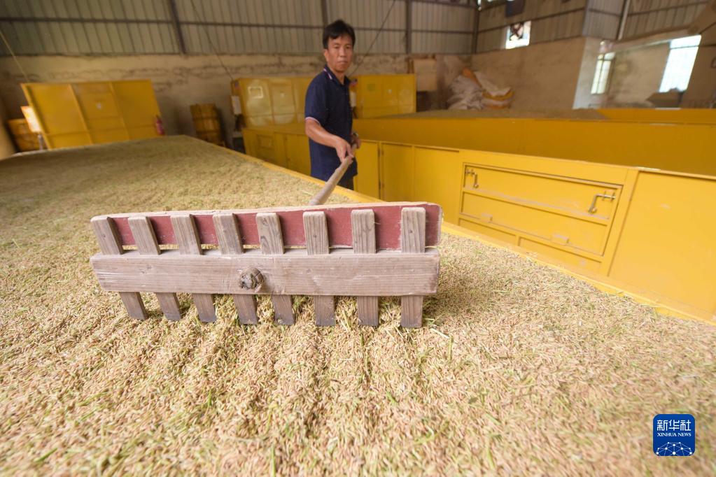8月11日,村民在貴州省黔東南苗族侗族自治州岑鞏縣注溪鎮周坪村雜交水稻制種基地烘烤種稻。