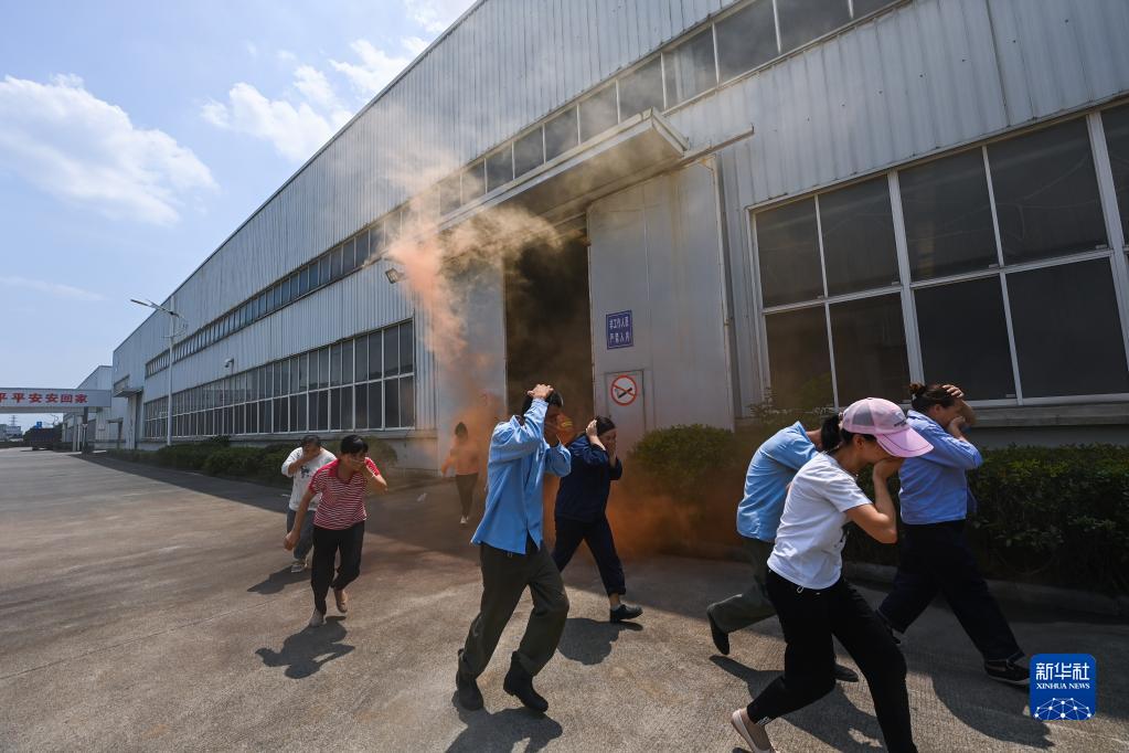 8月11日,在道場(chǎng)鄉城南工業(yè)園區,企業(yè)員工參加逃生演練。