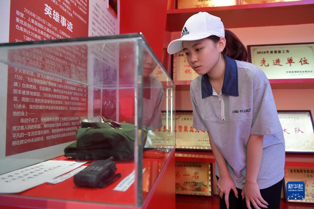 8月9日,在萍鄉市上栗縣消防救援大隊陳列館陶杰烈士紀念展區前,陶佳煜在看父親犧牲時(shí)使用的對講機和制服。