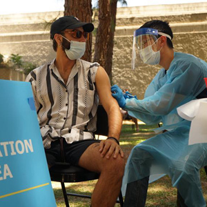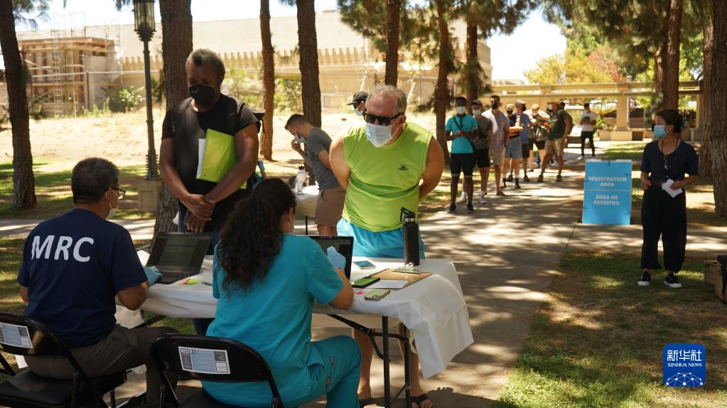 8月11日,人們在美國洛杉磯一處猴痘疫苗接種點(diǎn)排隊接種。