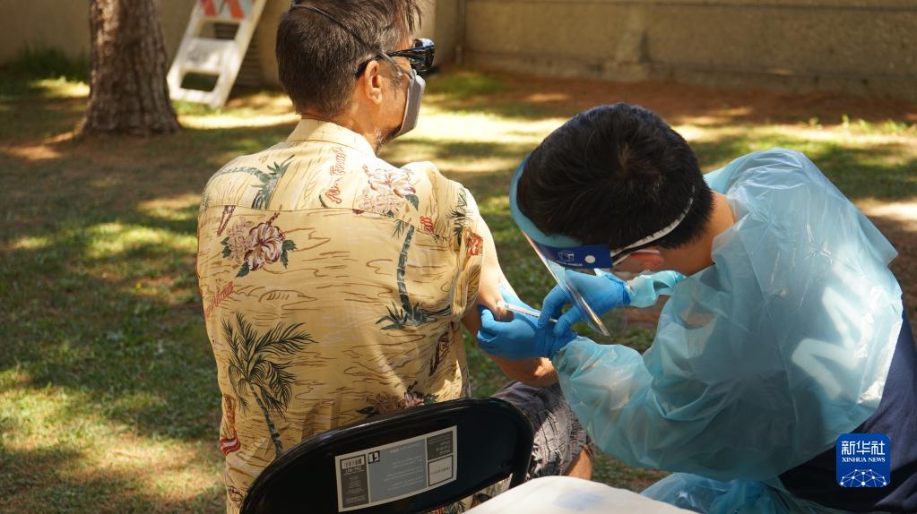8月11日,醫護人員在美國洛杉磯一處猴痘疫苗接種點(diǎn)為一名男子接種疫苗。