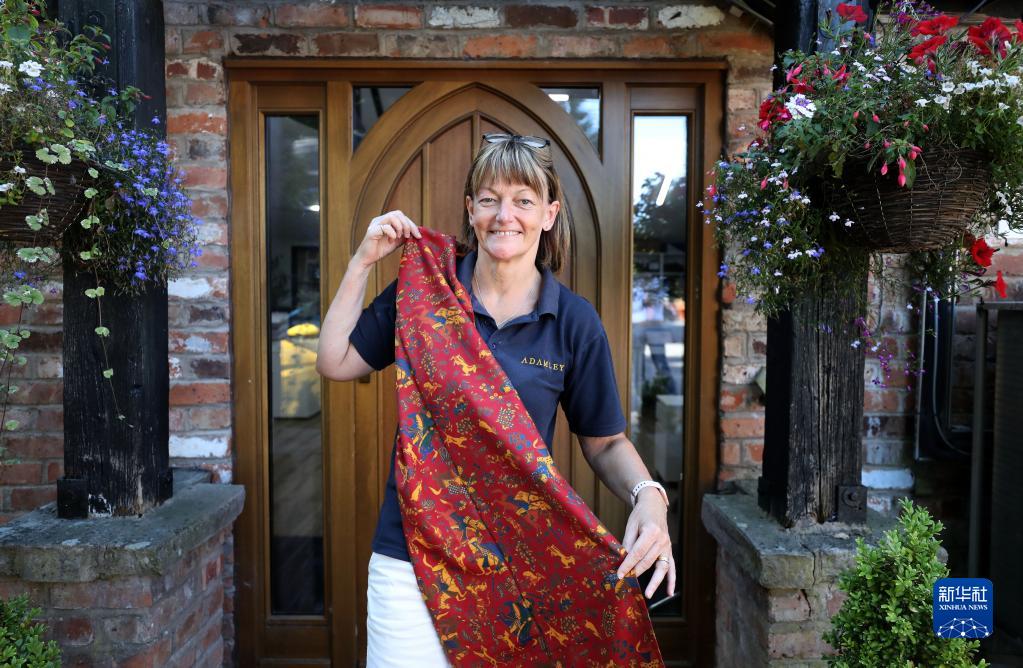 8月11日,在英國麥克爾斯菲爾德一家絲綢工廠(chǎng),工作人員展示絲綢產(chǎn)品。