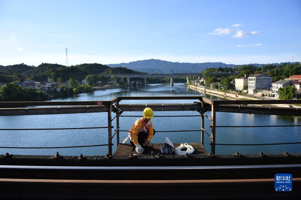 8月11日,橋隧工在滬昆鐵路新舞水鋼梁橋準備巡檢作業(yè)。