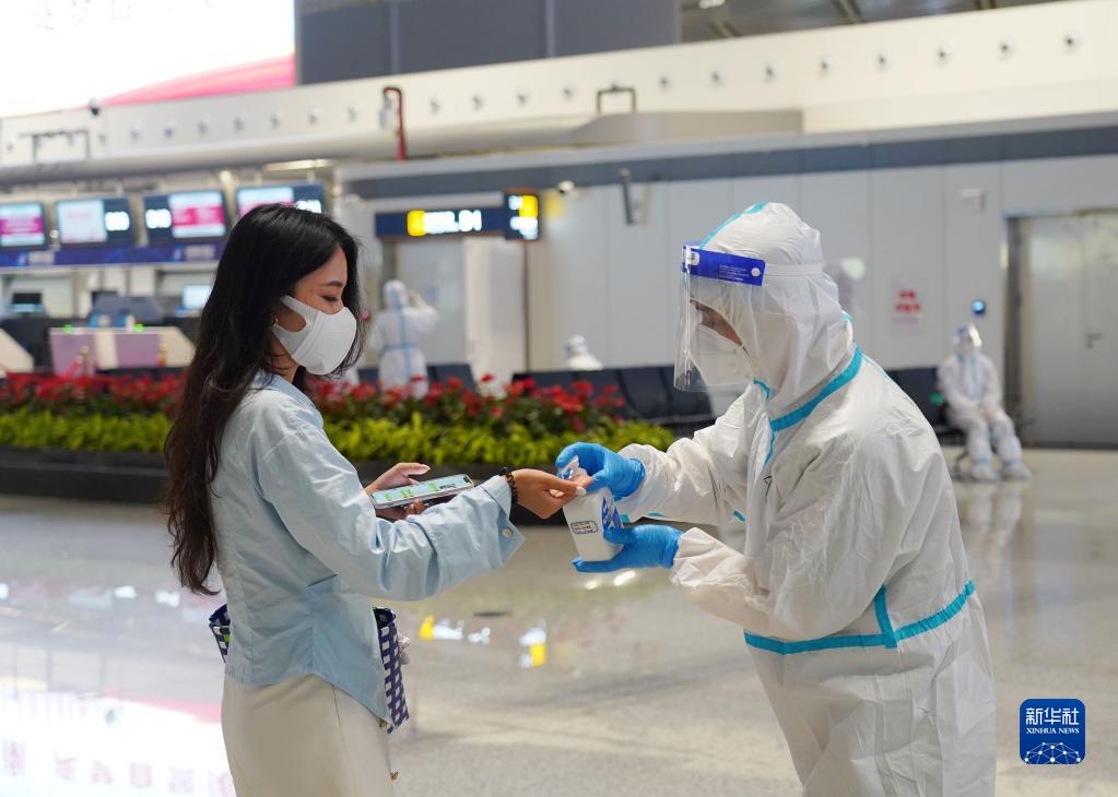 8月11日,機場(chǎng)工作人員對旅客進(jìn)行手部消毒。
