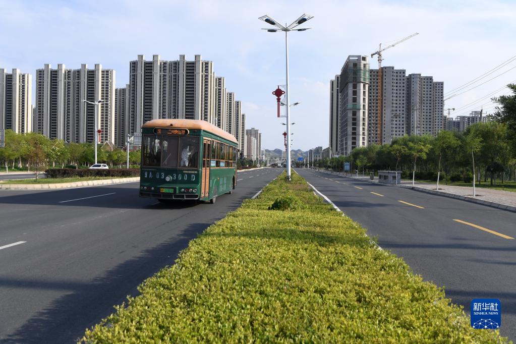 一輛新能源公交車(chē)行駛在蘭州新區(8月9日攝)。