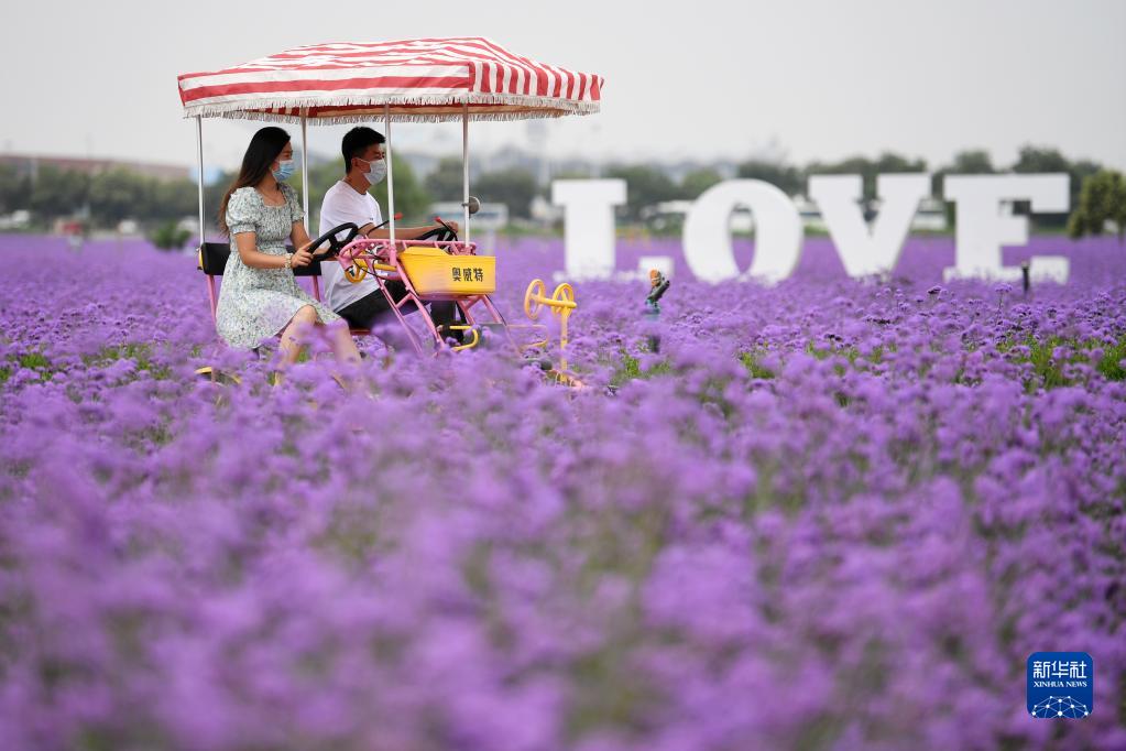 游客在蘭州新區臨港花海游玩(8月10日攝)。