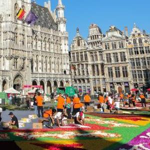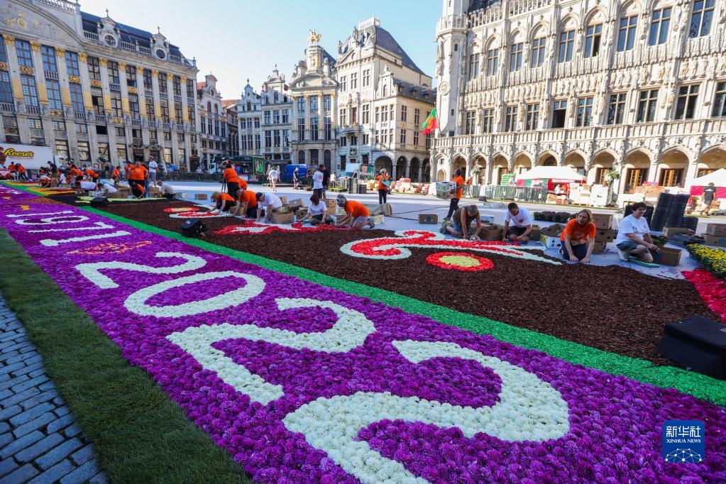 8月12日,工作人員在比利時(shí)布魯塞爾大廣場(chǎng)鋪裝“鮮花地毯”。