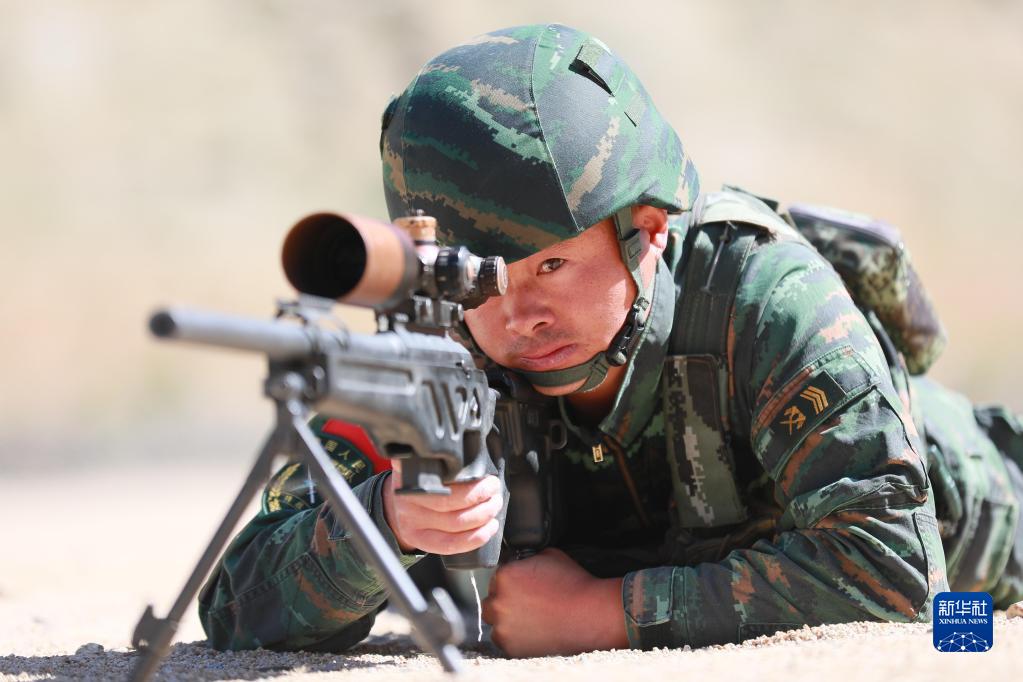武警西藏總隊某中隊副小隊長(cháng)楊友剛在狙擊訓練中(2022年7月5日攝)。新華社發(fā)(蔡健坤 攝)