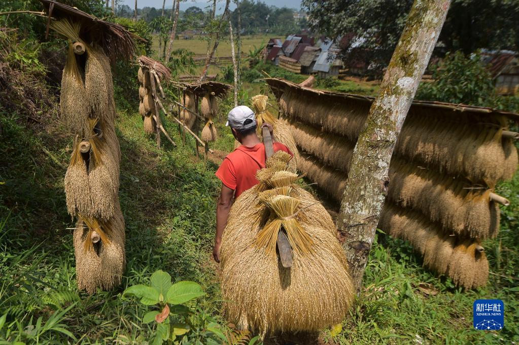 8月9日,農民在印度尼西亞萬(wàn)丹省奇托雷克村搬運稻谷。