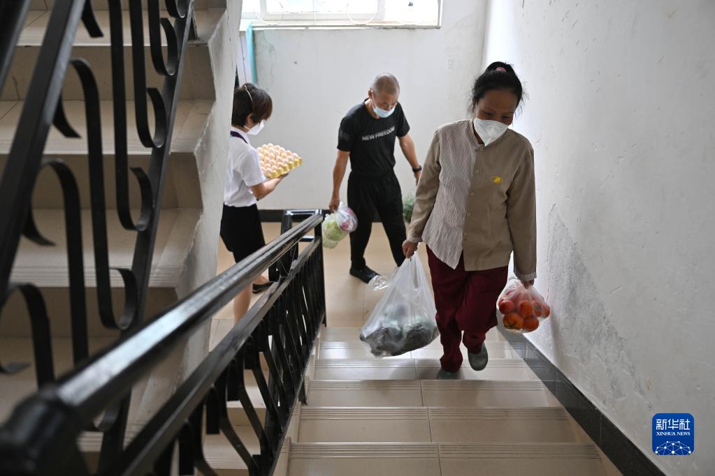 8月13日,三亞市一個(gè)小區的物業(yè)工作人員(左一、右一)幫居民將生活物資送往家中。