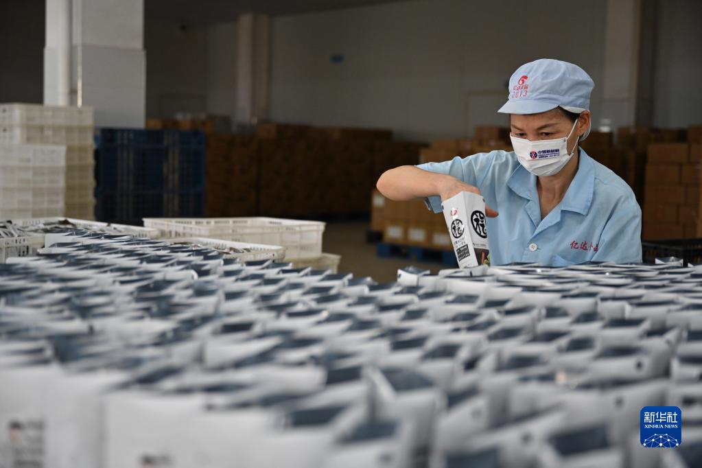 8月12日,在連江縣一家海帶食品加工企業(yè)車(chē)間,工人打包袋裝食品。