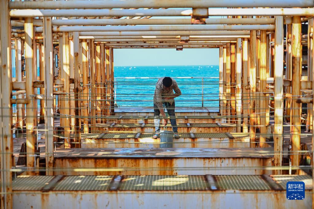 8月12日,工人在連江縣深海鮑魚(yú)機械化養殖平臺“福鮑1號”作業(yè)。