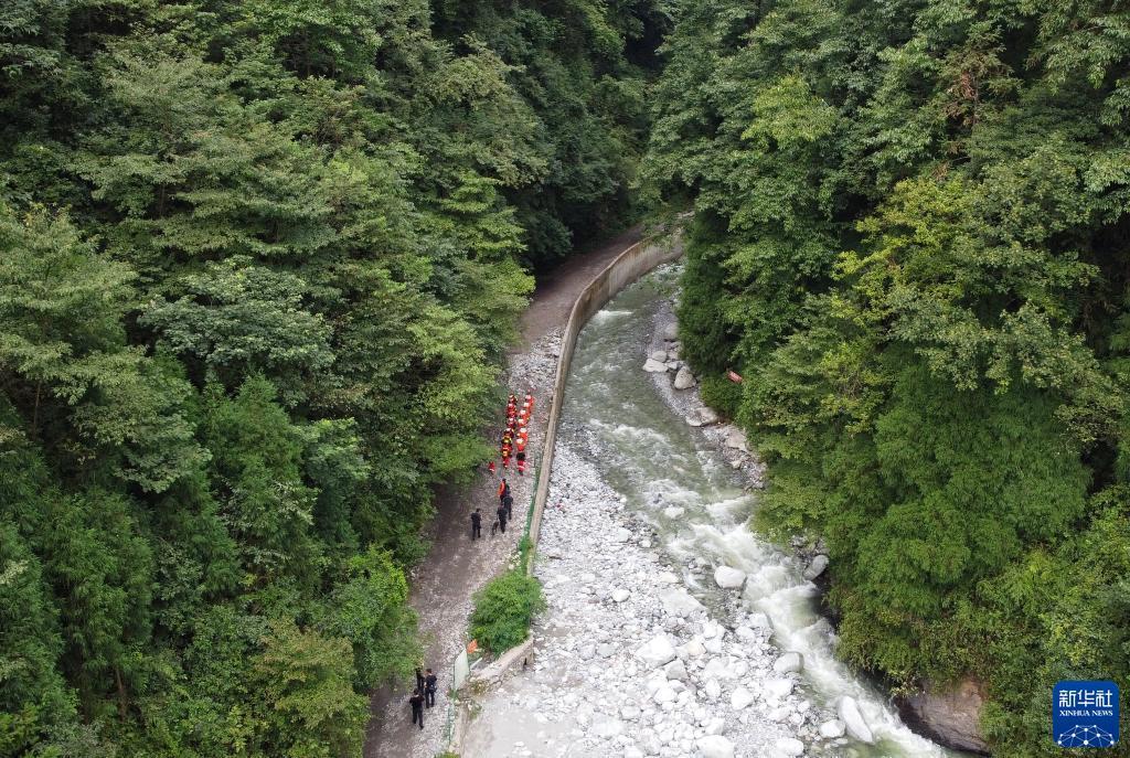 8月14日,在四川省彭州市龍門(mén)山鎮龍槽溝,消防救援人員在搜救(無(wú)人機照片)。