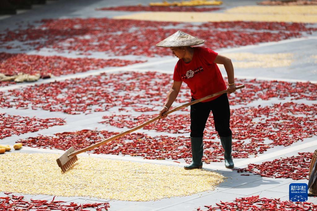 立秋過(guò)后,貴州高原鄉村處處曬秋忙。玉米、辣椒、稻谷、黃豆等農作物晾曬在農家房前屋后,與周?chē)鷦e具特色的田園風(fēng)光融為一體,繪就出一幅幅美麗的豐收圖景。